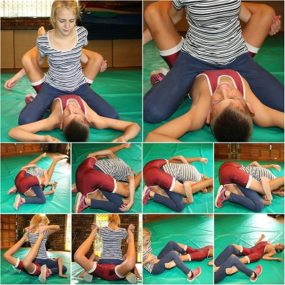 We showcase : arm bars, nelsons, super nelsons, ab stretches, backbreakers, referee breakdowns, bearhugs, boston crabs, bully pins, butterfly pins, reverse fig4 head scissors, camel clutches, cradles, fig4 body scissors, grapevines, knock outs, limp play, tight waist control, romeros, over-the-shoulder backbreakers, reverse t-lifts, body scissors, head scissors, sleepers, referee positions, side holds, t-lifts, torture racks, spladles, stacks, schoolboy pins, full weight sitting, foot fighting, smothers, arm locks, riding techniques, victory poses, gut punching, kicks, head locks, raised head locks, tight waist holds, bridging, pink panther pins, in hook pins, upper quarter body pins, banana splits, hammer locks and lots-lots more!